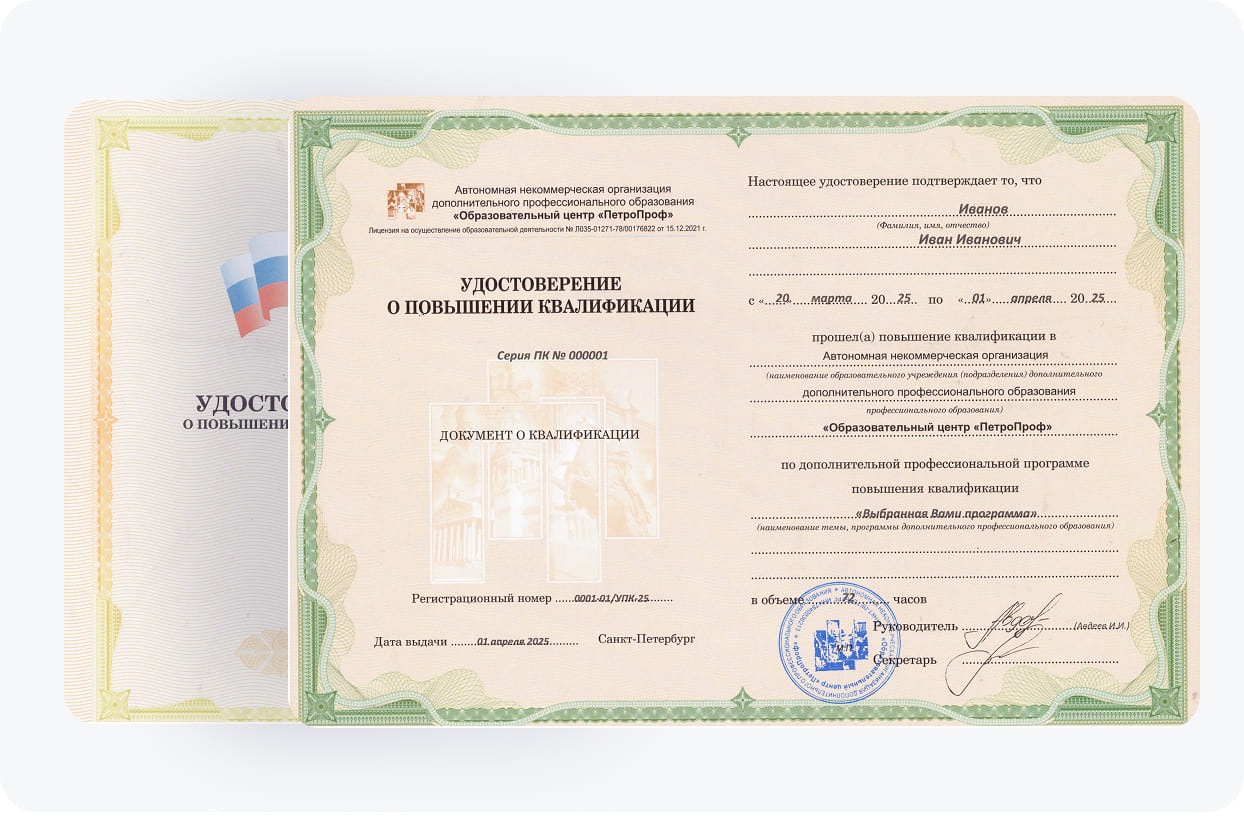 По завершении курса наши слушатели получают удостоверение о повышении квалификации (УПК). Этот документ об образовании подтверждает освоение актуальной программы и свидетельствует о компетентности в вопросах изучения почвенных ресурсов, экомониторинга земель и управления плодородием почвы. Мы гордимся тем, что наша образовательная деятельность лицензирована государством.